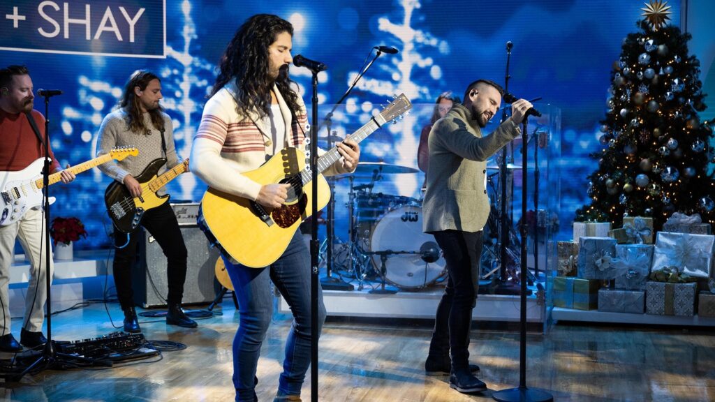 Shay performs alongside Dan Smyers from Dan + Shay. Their height difference is noticeable.